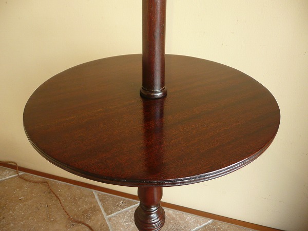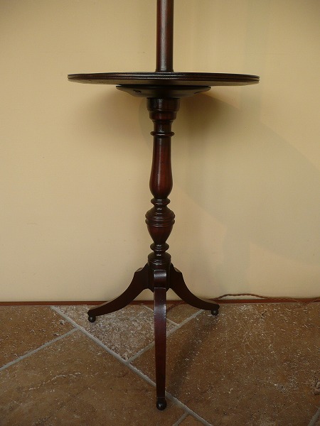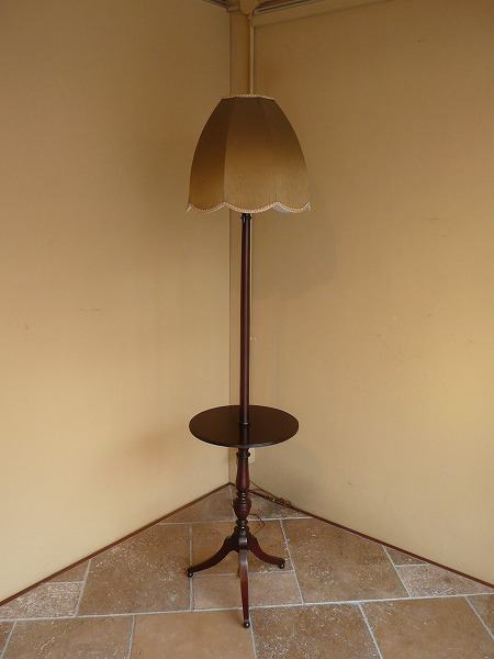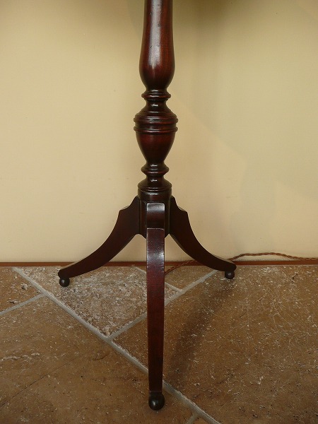 上質のマホガニー材が贅沢に使用された、プロポーションの美しさが際立つフロアスタンド 一般的なものと比べ高さが低く、様々なシチュエーションでご使用いただけます。本体支柱部には繊細な彫刻細工が上品に施され、脚部のクラシカルなトライポッド(一柱三足)と絶妙の調和を奏でています。優しい色合いの愛らしい布シェードとの相性も良く、落ち着いた優雅気を演出してくれます。※二股ソケットとなります。電球の口金は主灯E26 副灯E12