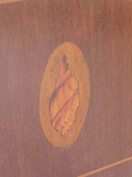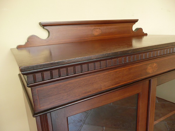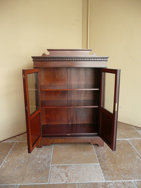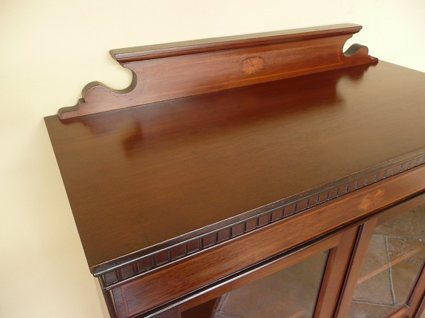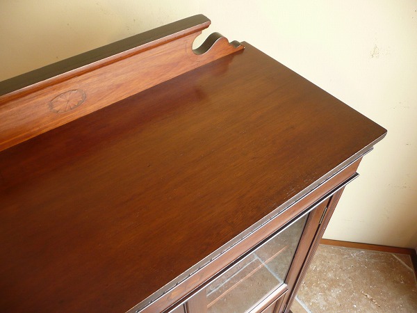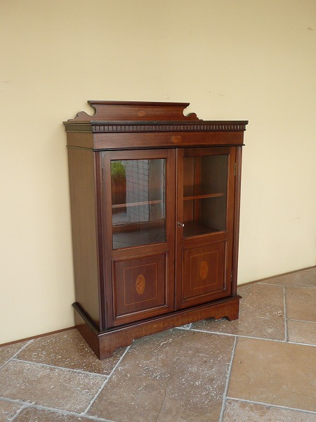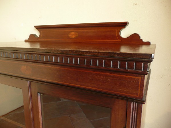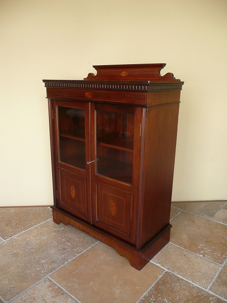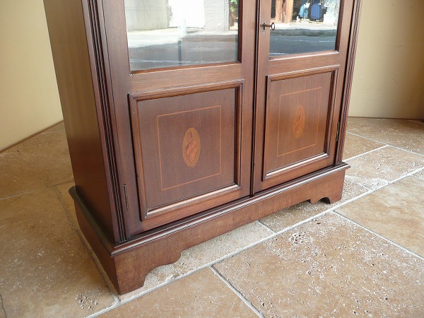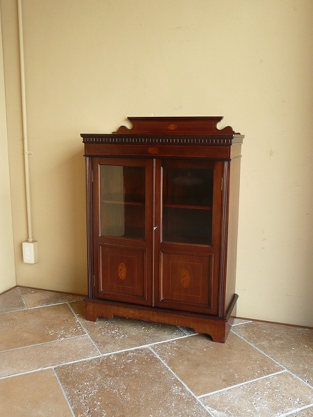 日本の住居事情に適した、サイズバランスに優れたスモールブックケース 月桂を重ねたエドワーディアン期特有の上品な佇まいが全面に映し出されています。左右扉のパネルには貝殻を模った、クラシカルなマーケットリーがバランス良くシンメトリーに配置されています。上質のマホガニー材をベースに、手工芸技術が冴え渡る、繊細かつ高級感漂うインレイ(象嵌)が各所に品良く取り入れられています。※上段の棚板は新しく制作しています。棚板の高さ位置は調整できません。