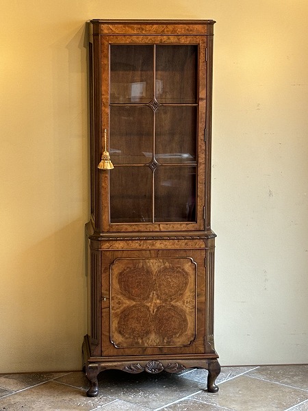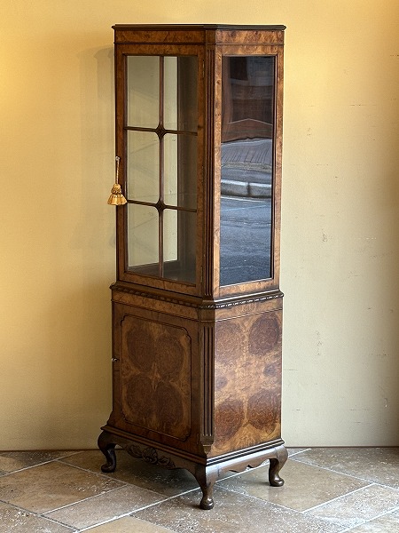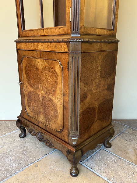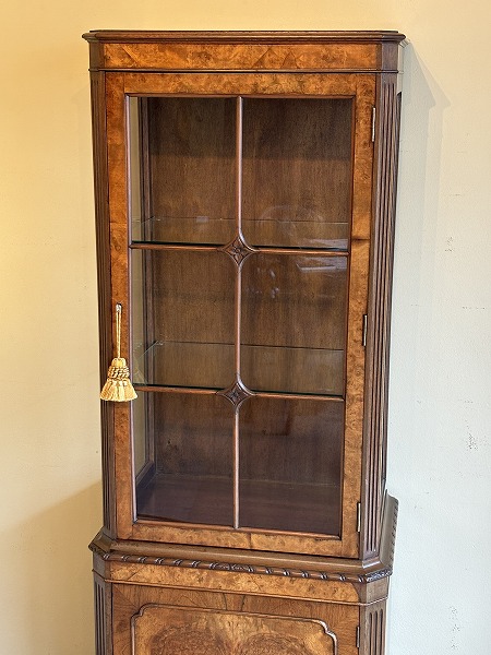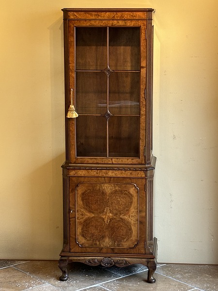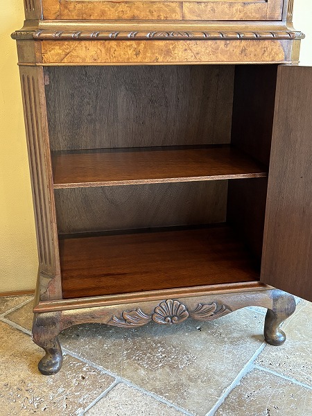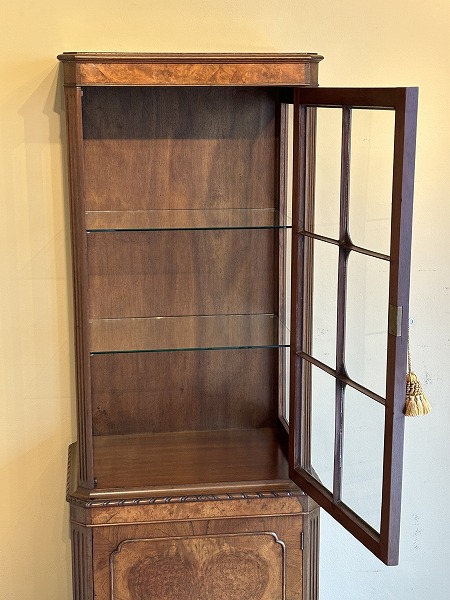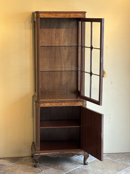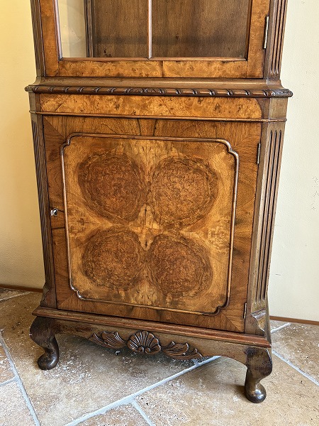 | 艶やかな杢目の美しさが際立つ、厳選された上質のウォルナット材が贅沢に使用されたグラスキャビネット 上台は三面のガラスにより構成され、ディスプレイするコレクションの魅力を引き立ててくれます。下台扉部・側面部に意匠を凝らした化粧彫り、要所に取り入れられた彫刻に愛らしいカブリオールレッグが絶妙の調和を奏でています。※上台内部のガラス棚板2枚は新調済み、下台内部の棚板1枚は取り外しが可能です。 |