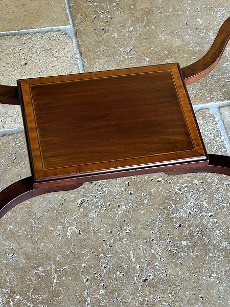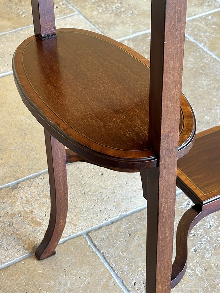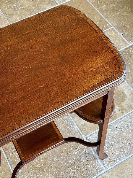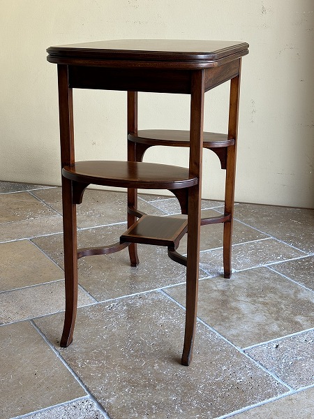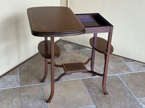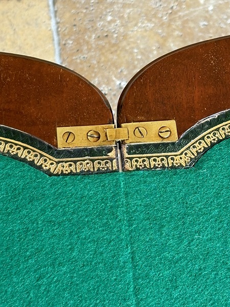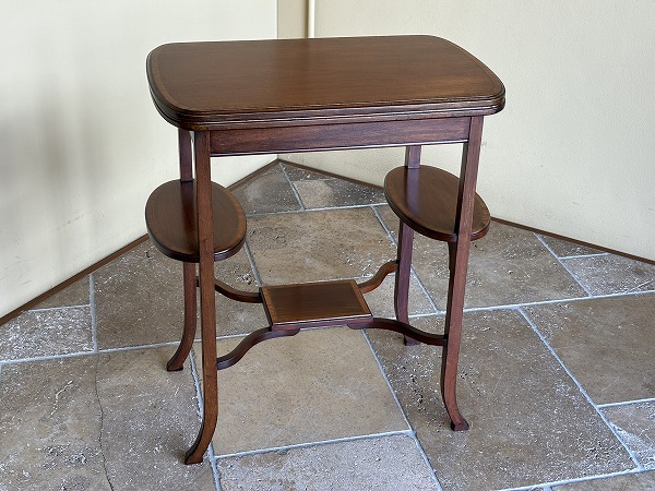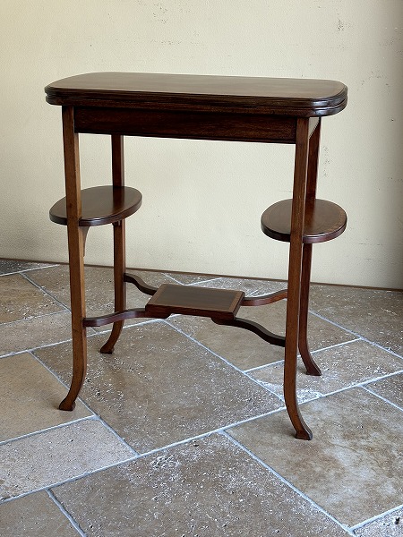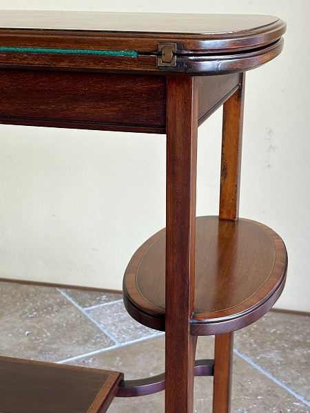 朧月を重ねて更に深みを増した、マホガニー材の艶やかな杢目が全体に広がりをみせる、スタイリングの美しいエドワーディアンカードテーブル 各所に丁寧に施された緻密且つ上品なインレイ(象嵌)が奥深いアンティークの魅力を更に引き立てています。