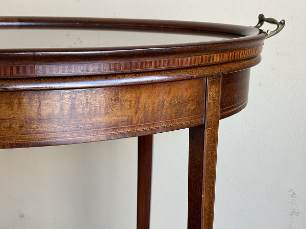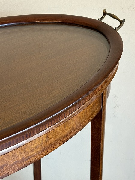 エドワーディアン期を象徴する、緻密且つ上品なスタイリングの美しさが一際目を惹くトレイトップテーブル 厳選された上質のマホガニー材をベースに、要所に施された気品漂うインレイ(象嵌)が最高の輝きを放ちます。※トレイのガラスは新調済み トレイ単体での使用も可能です。