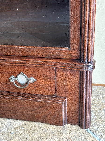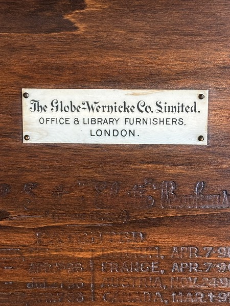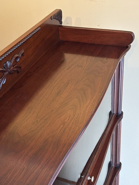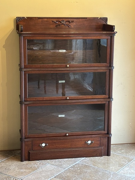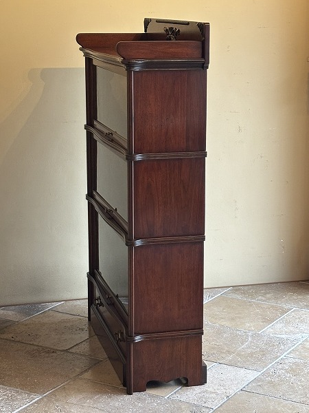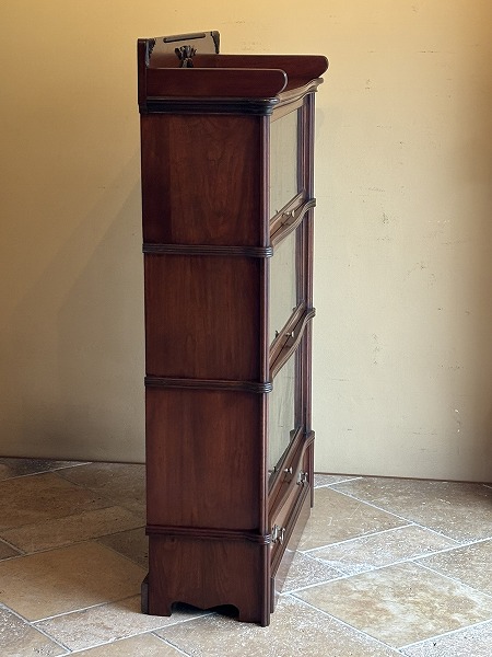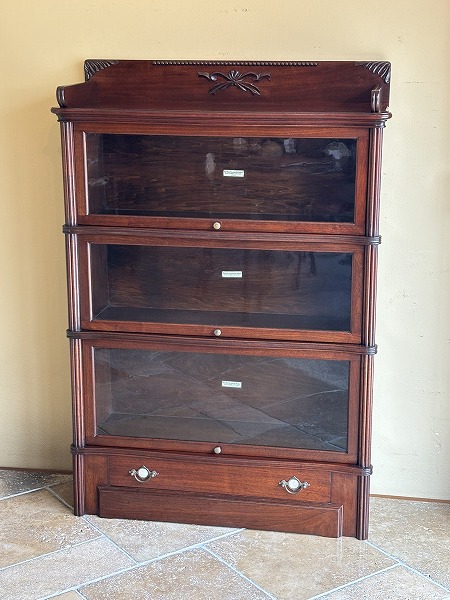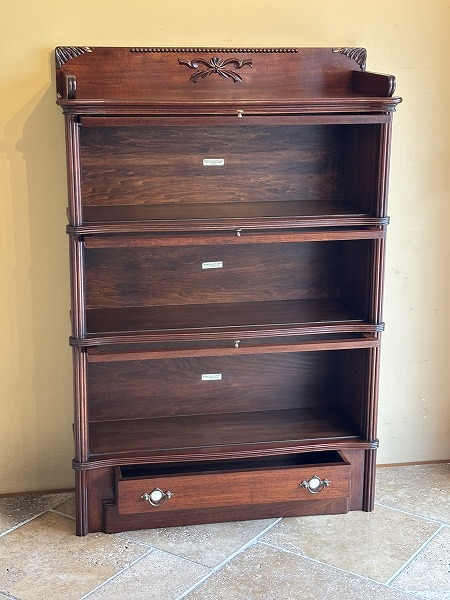 | globe-Wernicke社製スタッキングブックケース 朧月を重ねたマホガニー材の風合いが色濃く映し出されています。前面には微妙な曲線が効いた美しいスタイリング、要所に取り入れられたクラシカルなアプライドオーナメントなど、奥深いアンティークの魅力を物語っています。 |