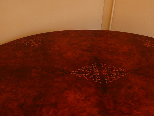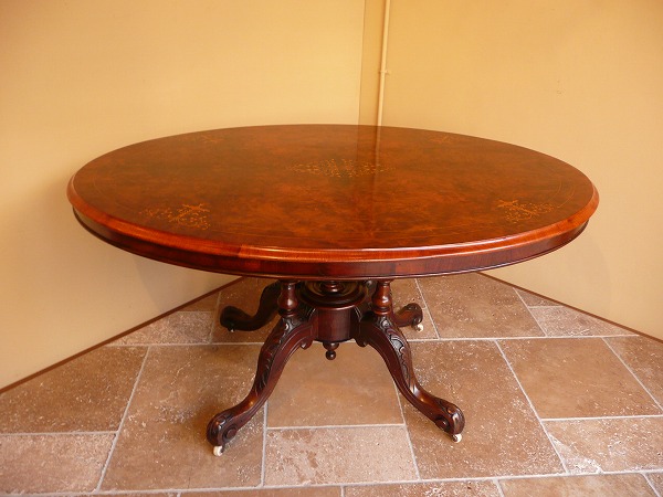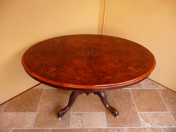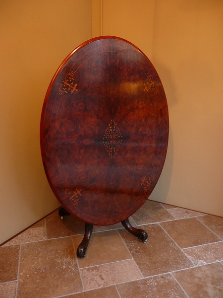 | 英国アンティークを代表するヴィクトリアン後期に生み出されたティルトップテーブル コレクターをも唸らせる気品に満ちた精緻なインレイ クラフトマンの粋を感じる天板トップベースのマホガニーにコーティングしたバールウォルナットを更に貼り合わせるという見事な手工芸技術、脚部のバードゲージプラットホームは上質のソリッドウォルナットの特性が活かされた躍動感のあるカーヴィングなどと余すところなくアンティークの魅力が凝縮されています。 |