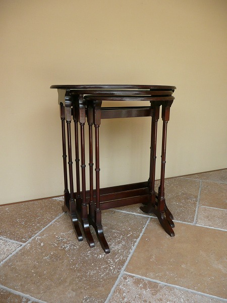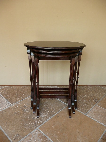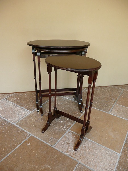 長い年月を経て蓄えられたアンティーク特有の風合いが全面に映し出されています。装飾性と実用性を兼ね備えたすっきりお洒落の入れ子式テーブル プロポーションの美しさが際立つクラシカルなオーヴァルトップに繊細なバンブー形状の脚部が絶妙の調和を奏でます。