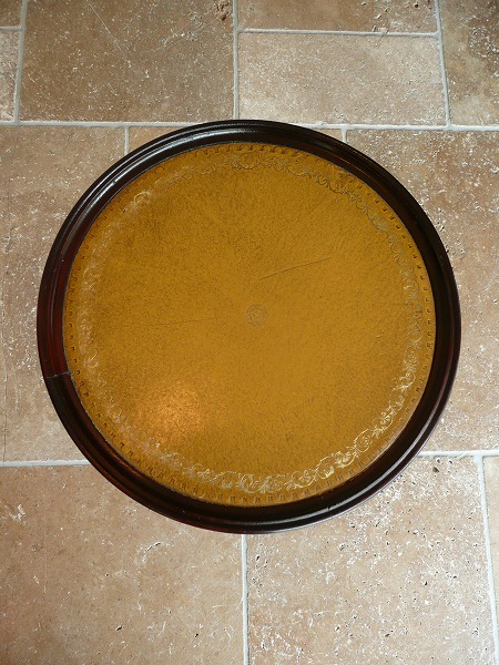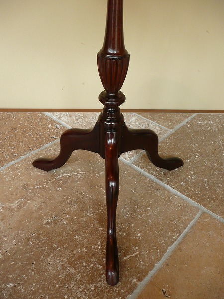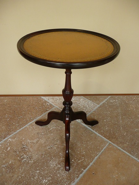 繊細且つ艶やかなマホガニー特有の美しい木目が全体に拡がっています。朧月を重ねたクラシカルなレザートップとトライポット(一柱三脚式)の流麗なラインが絶妙の調和を奏でます。