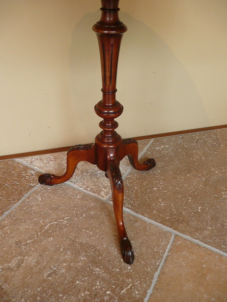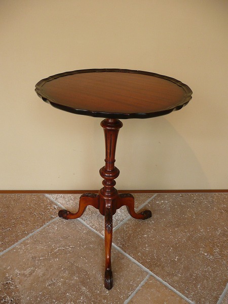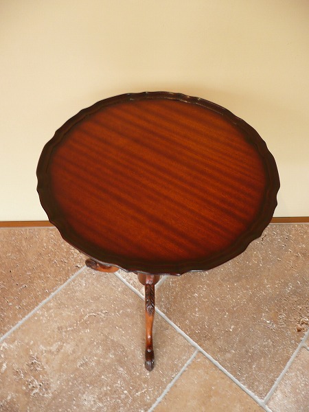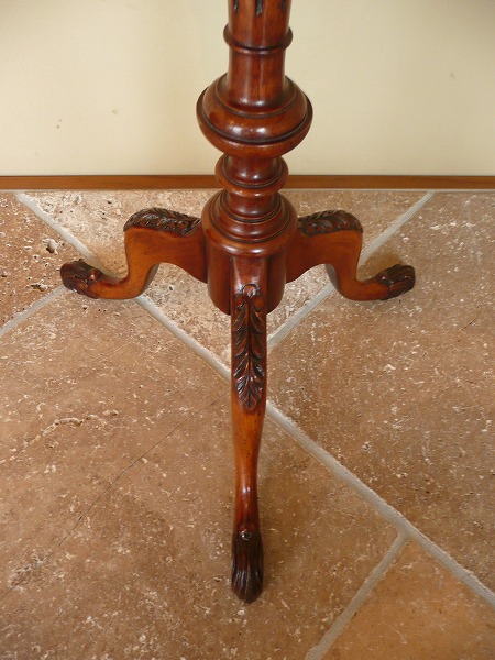 厳選された上質のマホガニー材の特質を最大限に活かし、エッジの付けられたトップとアーカンサスカーヴィングが刻み込まれたクラシカルなトライポットの脚部が輝きを放ちます。