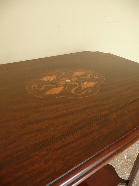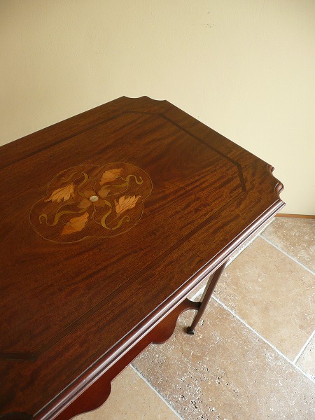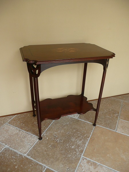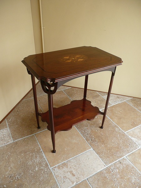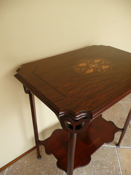 典型的な英国アールヌーヴォー様式の影響が色濃く映し出された、利便性を兼ね備えたオケージョナルテーブル 天板トップに配された絵画のような気品漂うヌーヴォーモチーフのマーケットリーをはじめ、コーナー部分には計算され尽くしたピアッシングなど脚部にまでクラフトマンの物作りへの拘りが窺い知れ、奥深いアンティークの魅力がストレートに伝わってきます。