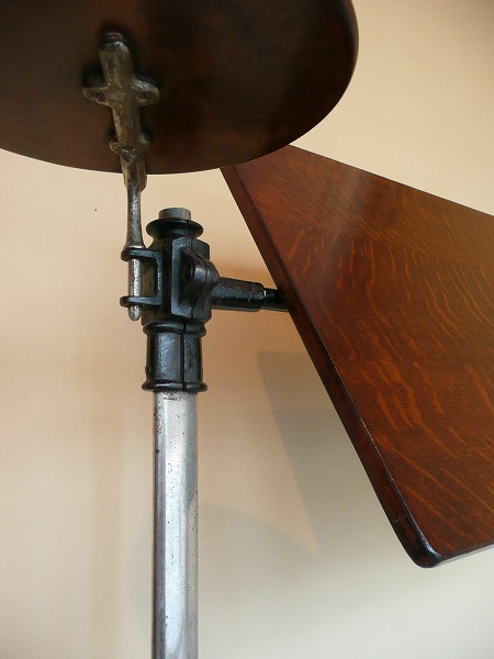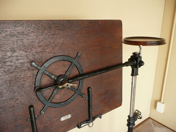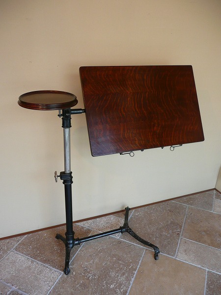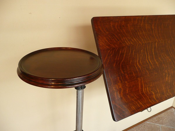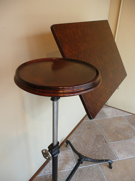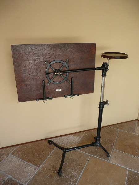アンティークの中でも極めてレアなコマーシャルアイテムのひとつ 不思議と見るものを虜にする作り手の発想力、感性の豊かさには驚きを隠せません。厳選したオーク材の高質感と使い込まれたアイアンとが絶妙の調和を奏でます。※ボード部分の上下昇降と角度調整が可能 サイドテーブル部分は回転式