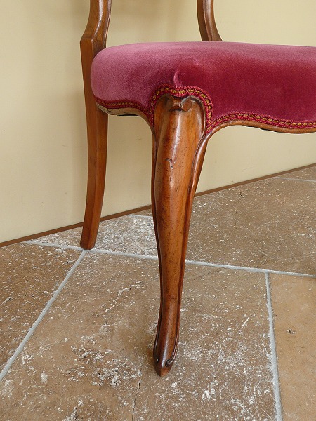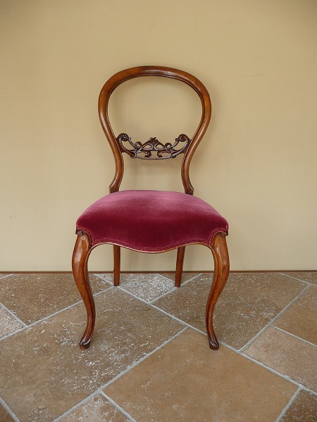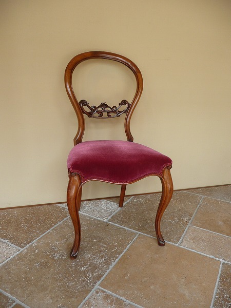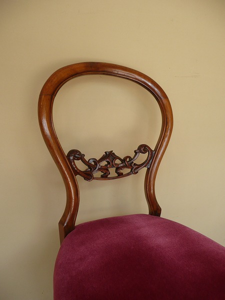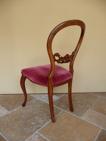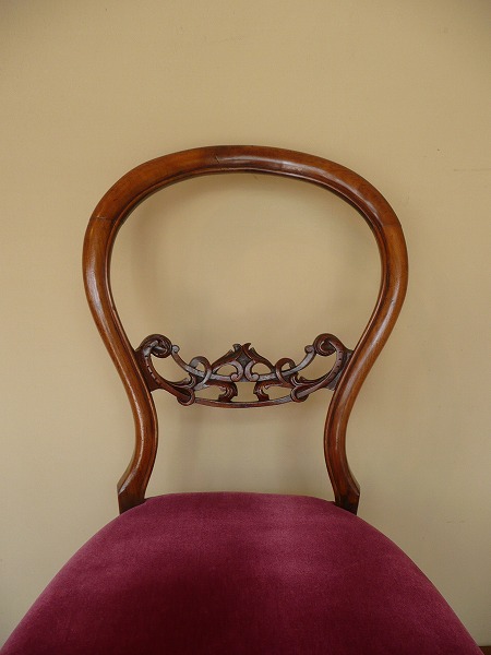 華美になりすぎることなくより洗練されたプロポーションの美しさが際立つバルーンバックチェアー 上質のウォルナット材の高質感と長い年月を経て生み出されたアンティーク特有の風合いが色濃く映し出されています。