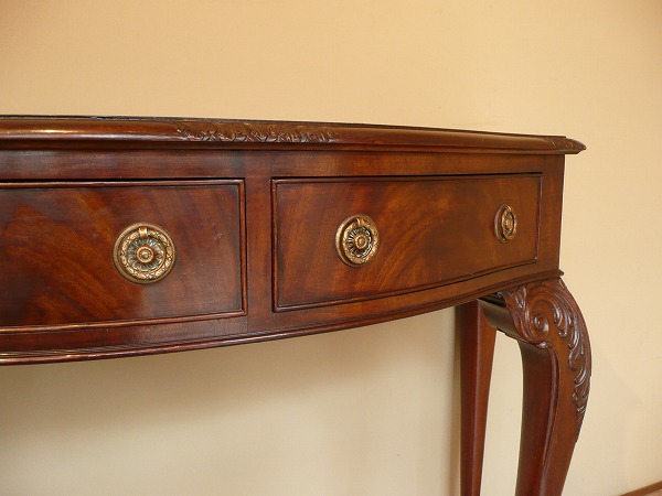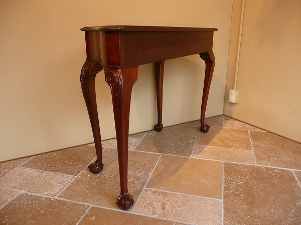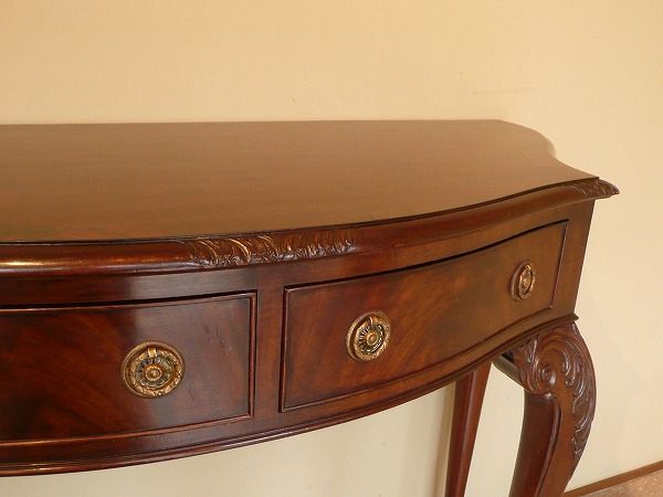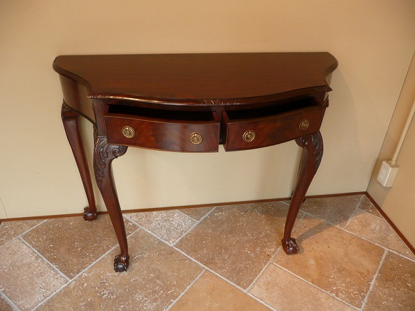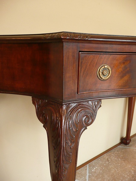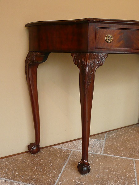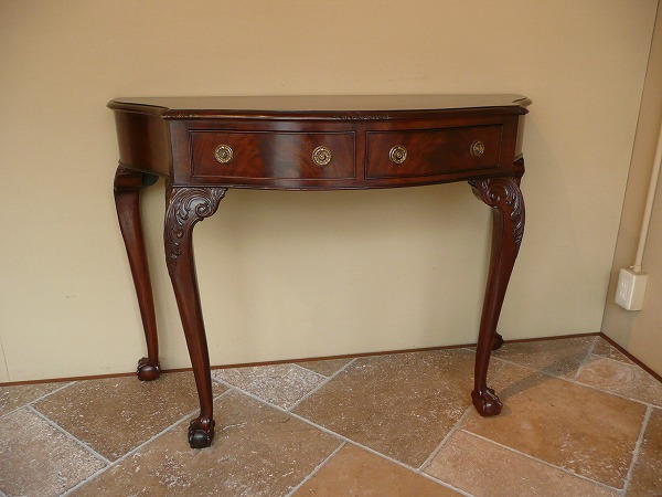 | ジョージアン期を彷彿とさせる、トーマス・チッペンデールの影響が色濃く映し出されたホールテーブル 脚部に見られる精巧なアカンサスカーヴィングとクロウアンドボールフィートが絶妙の調和を奏でています。トップは特異的なサーペンタイン形状に抽斗がバランス良く配置されています。サーペンタインとは蛇(SERPENT)からきたもので、曲がりくねった、蛇行したなどの意味があります。満月を重ねてしっとりと古艶を纏びたマホガニー材の質感が、奥深いアンティークの魅力をはっきりと物語っています。 |
