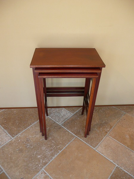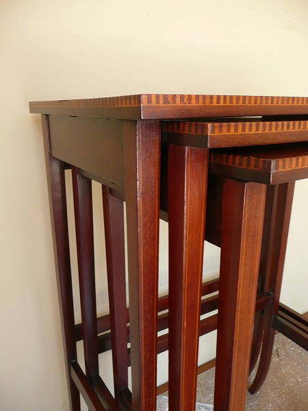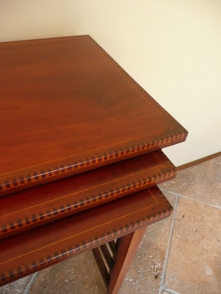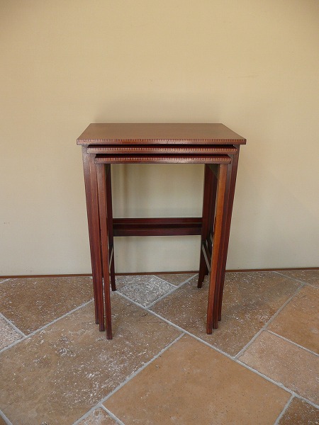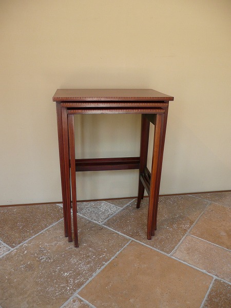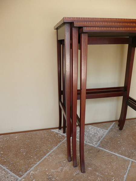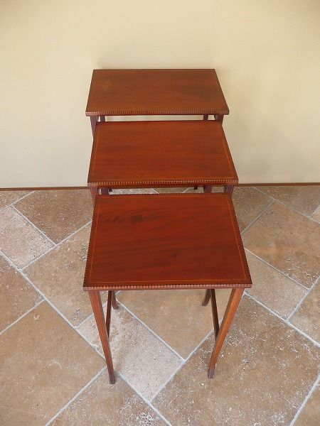 厳選された上質のマホガニー材の美しい木目が印象的なネストオブテーブルズ エドワーディアン期を象徴する繊細な脚部ラインとトップの四方に丹念に配されたクラシカルなインレイとが絶妙の調和を奏でています。一般的なものと比較すると、やや高めに設定された珍しいタイプとなります。単体として様々なインテリアシーンで重宝する逸品です。