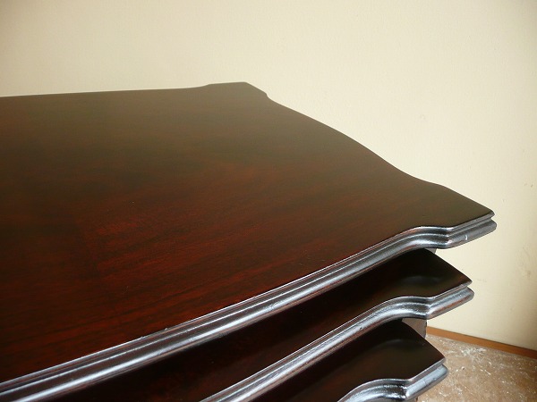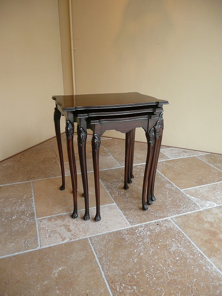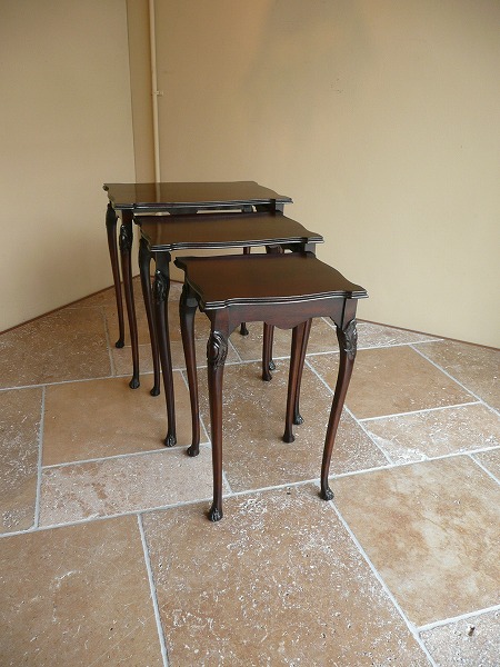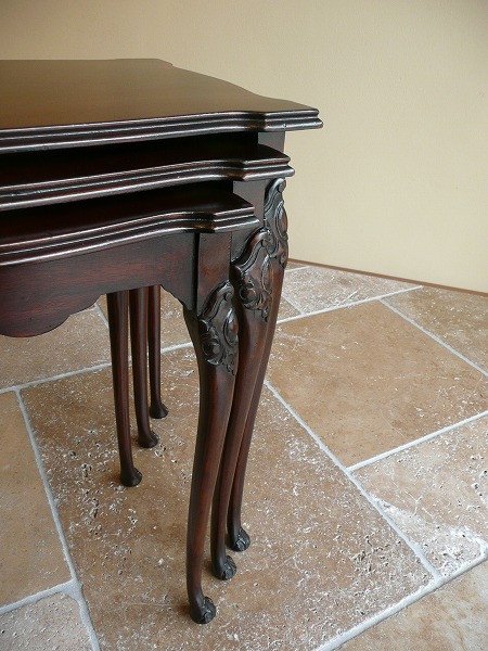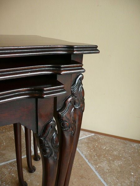 満月を経てアンティーク特有の風合いが色濃く映し出された、ヴィクトリアン後期に生み出されたネストオブテーブルズ 上質のマホガニー材の特質が最大限に活かされ、要所に取り入れられたクラシカルなカーヴィングをはじめ、スタイリングの美しさが際立つ逸品です。
