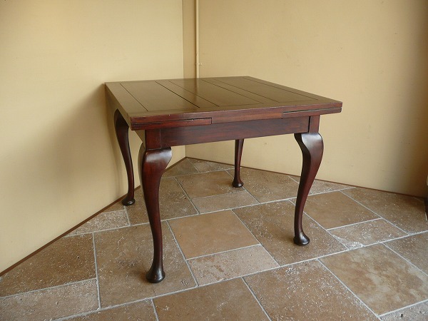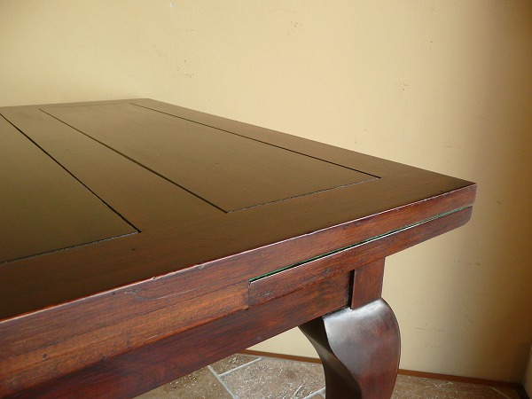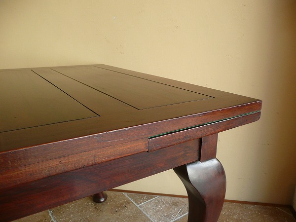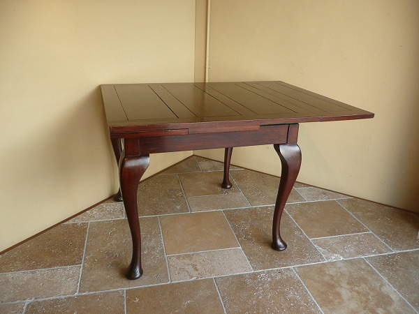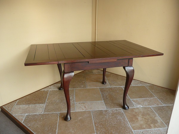 厳選された上質のマホガニー材が惜しみなく使用されたクィーンアンドローリーフテーブル(伸長式ダイニングテーブル) ソリッドマホガニーの高質感をはじめ、優美な印象を持つカブリオールレッグとが絶妙の調和を奏でています。