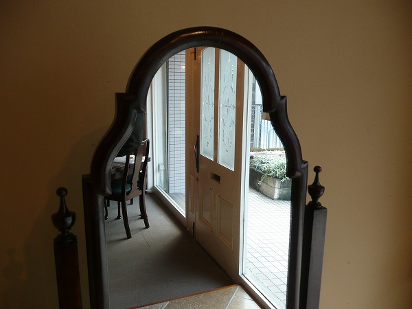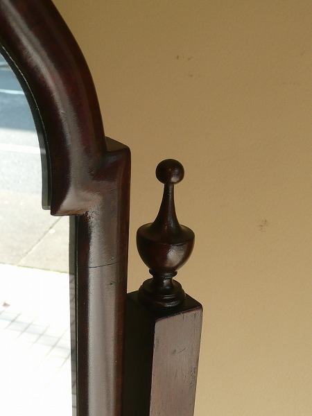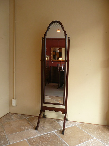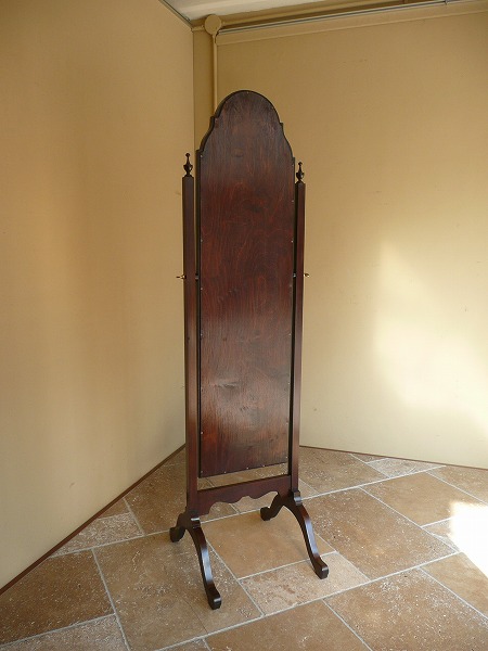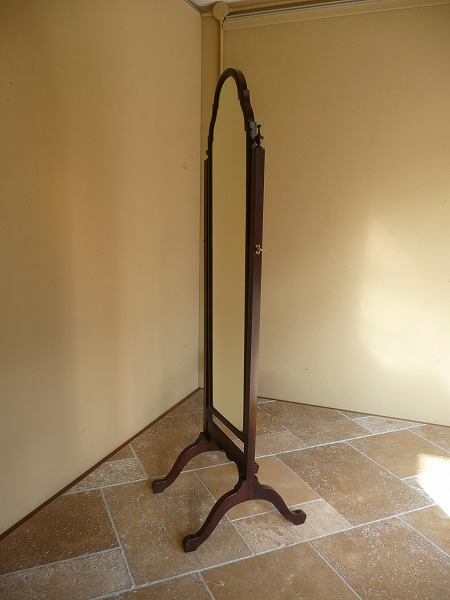 ミラーの角度を調節することが可能な、装飾性と機能性にも優れたシュバルミラー シュバルとはフランス語で「馬」の意 脚部が馬の脚に似ているところから、その名が付けられたとされています。艶やかなマホガニー材の質感をベースに、クラシカルな曲線を効かした、美しいフレームワークと繊細且つ気品漂うスタイリングの美しさが最高の輝きを放ちます。※オリジナルと同形状にてミラー新調済み
