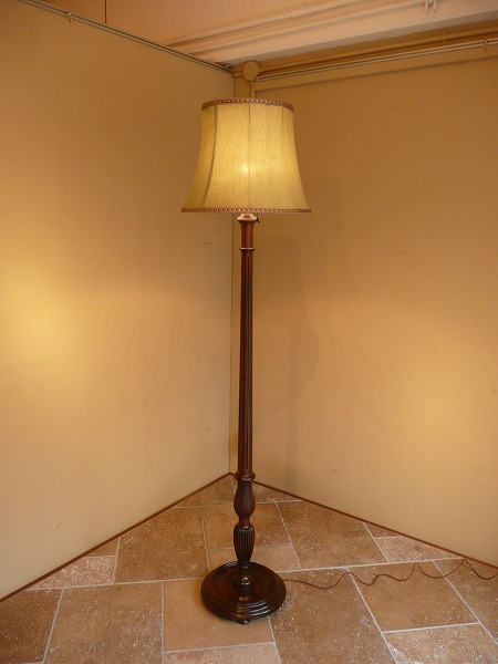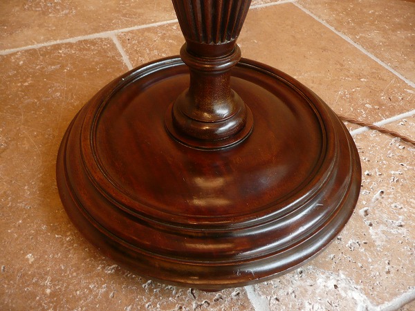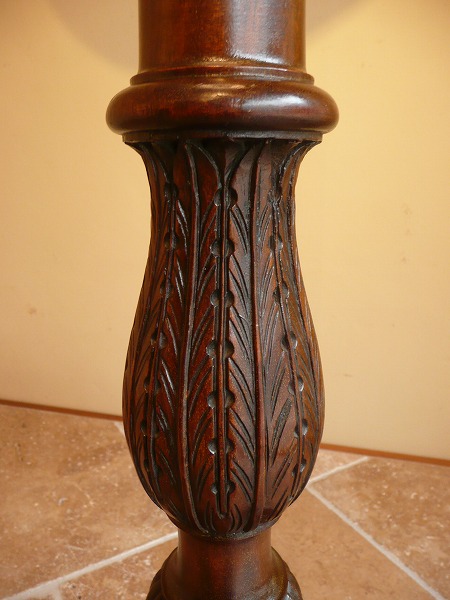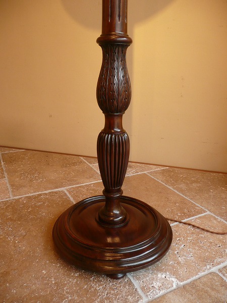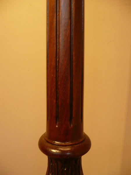 | コラムにはリーディング(裾源彫り)をはじめ、繊細且つ気品漂う彫刻がバランスよく配された、スタイリングの美しさが際立つフロアスタンド 艶やかなマホガニー材の木目が最大限に活かされ、台座部分には安定感をもたらすバンフィート(ハンバーガーに使用される丸型のパンの形状)が品良く取り入れられています。※二股ソケットとなります。電球の口金は主灯E26 副灯E12 |