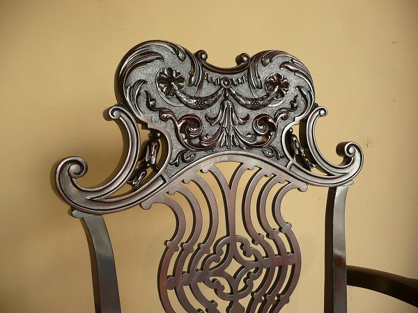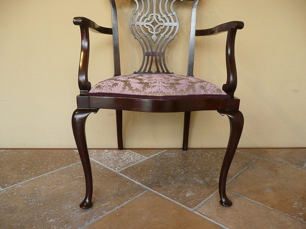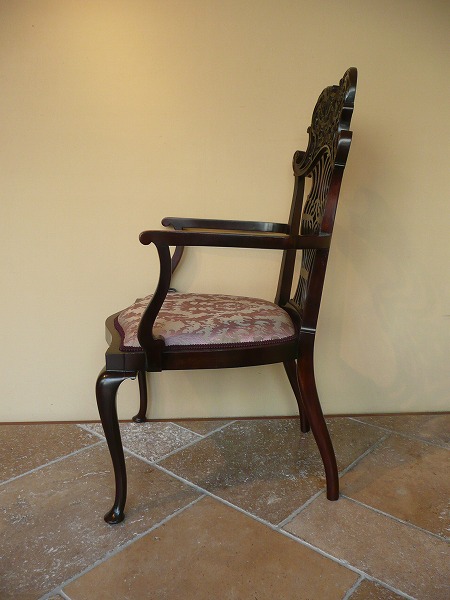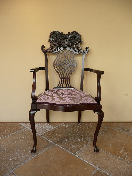 トップレールの独創的な意匠を凝らした、高級感溢れる彫刻の美しさが際立つアームチェアー レイトヴィクトリアン特有の風合いをはじめ、クィーンアンスタイルの流れを汲むカブリオールレッグなど、細部にまで作り手の拘りが凝縮された逸品です。