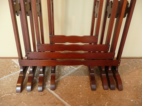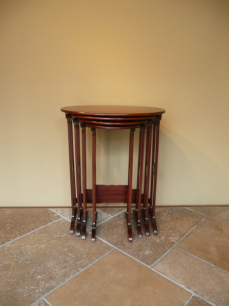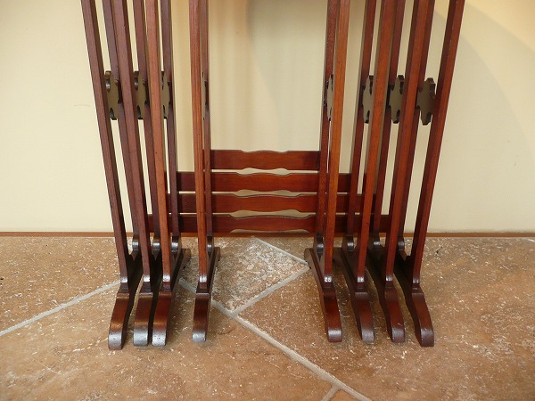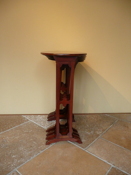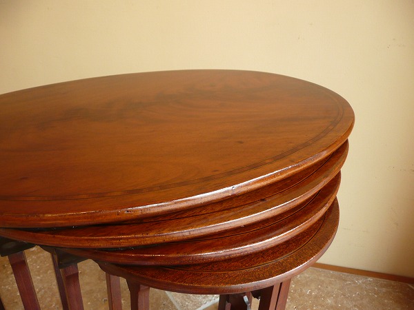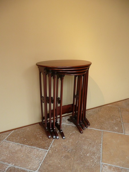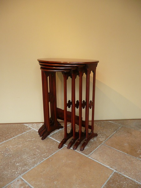 ネスト(入れ子式)テーブルは、一般的に3SETで構成されているものが大半を占めますが、こちらは珍しい4SETのカルテットテーブルズ 意図的に過度の装飾を抑え、素材本来の持ち味を引き立てています。天板トップを彩るクラシカルなインレイ(象嵌)が良いアクセントとなり、繊細な脚部と絶妙の調和を奏でています。