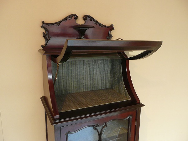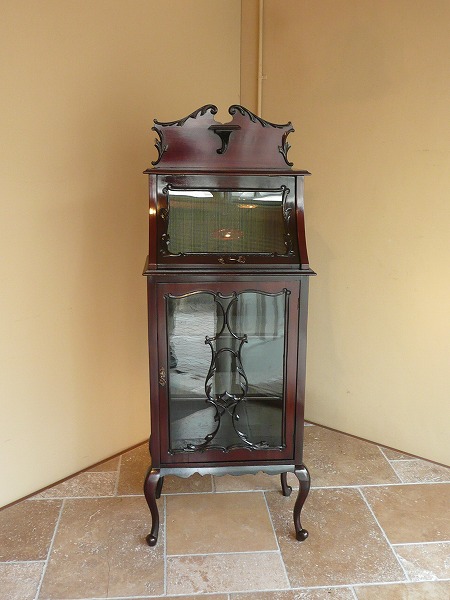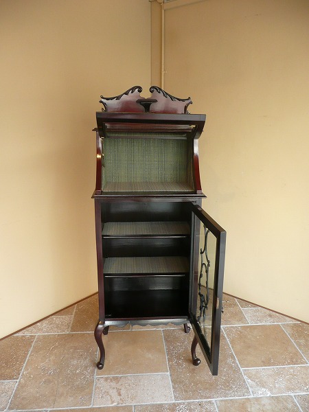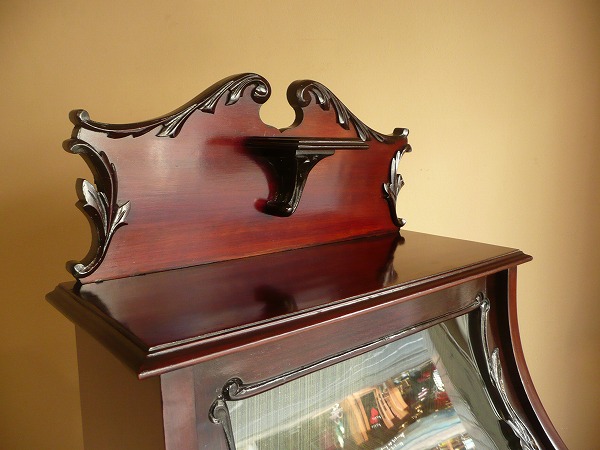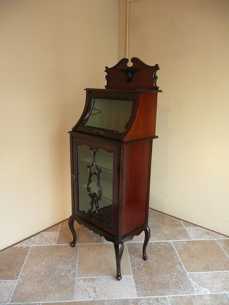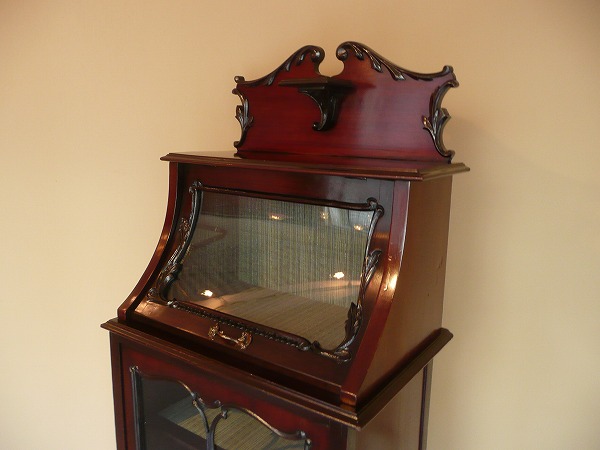 | 厳選された上質のマホガニー材が贅沢に使用され、スタイリングの美しさが際立つキャビネット 最上部にはクラシカルなスワンネックペディメント、上部ディスプレイスペースのフラップには曲面ガラスが使われるなどコレクションを引き立てる、一味違った趣のあるディスプレイをお愉しみいただけます。下部扉にはヴィクトリアン期を象徴する、透かし彫りのモールディングがバランス良く取り入れられるなどアンティークの奥深い魅力が閉じ込められた逸品です。※内部クロス新調済み |
