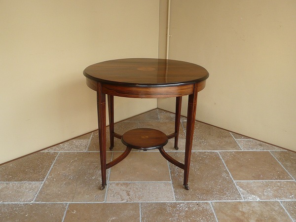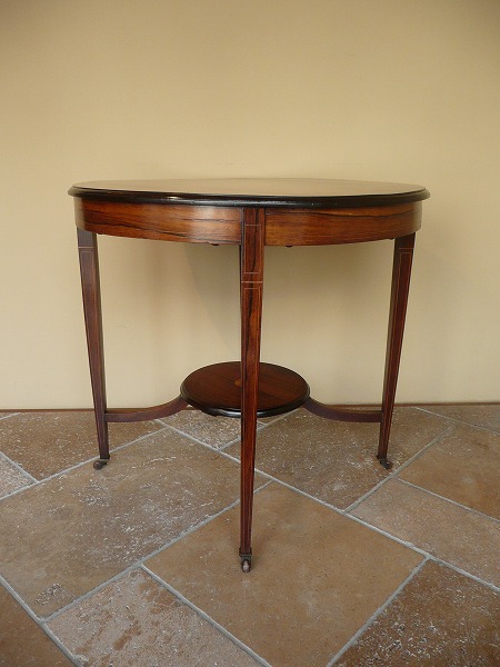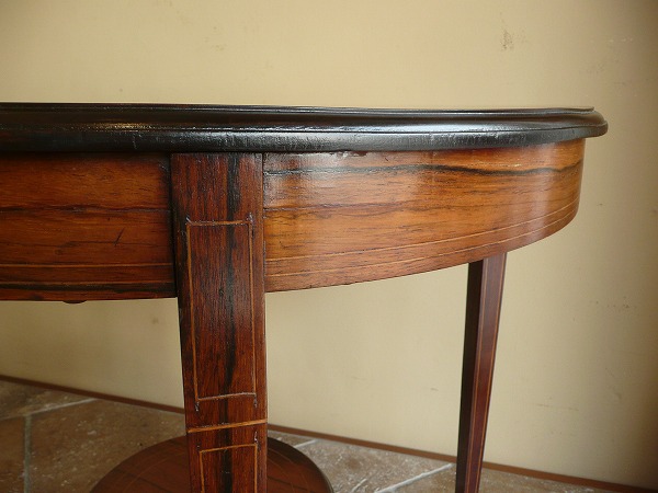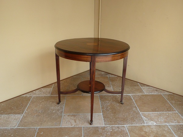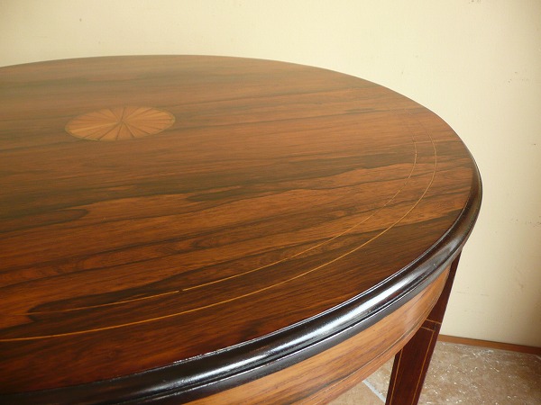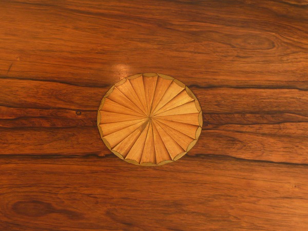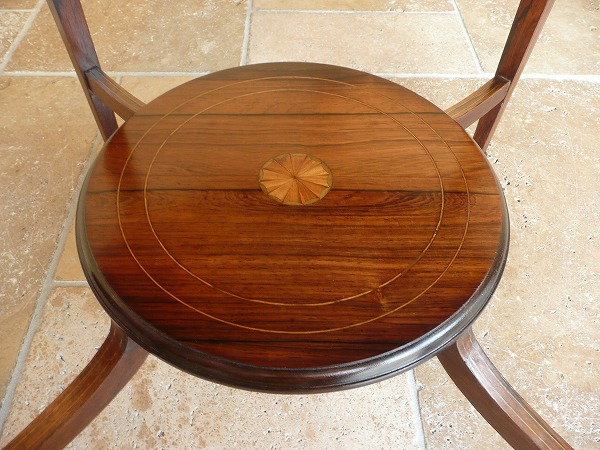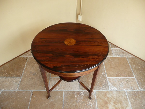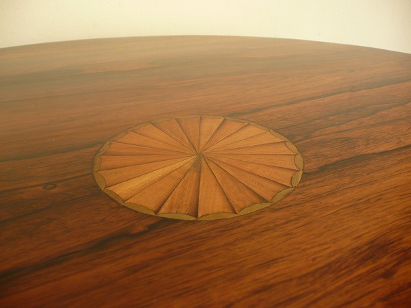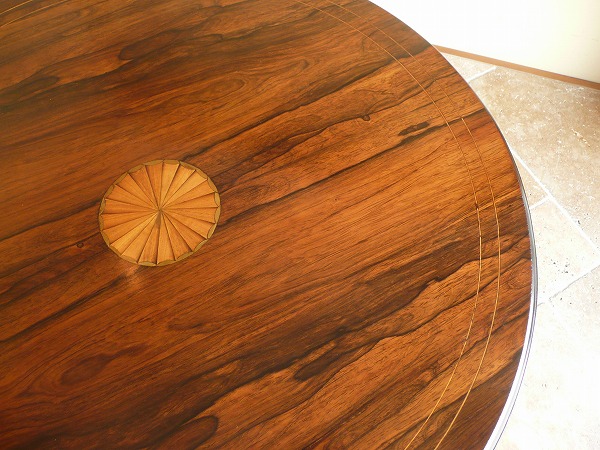 厳選された上質のローズウッド材が贅沢に使用された、端然とした佇まいが印象的なジョージアンリバイバルのティーテーブル ローズウッド特有の美しい木目をベースに、各所に品良くインレイ(象嵌)が施されています。天板トップと下部中央には、ロゼッタと呼ばれる放射状に広がる太陽を模ったインレイが配され、奥深いアンティークの魅力を更に演出しています。