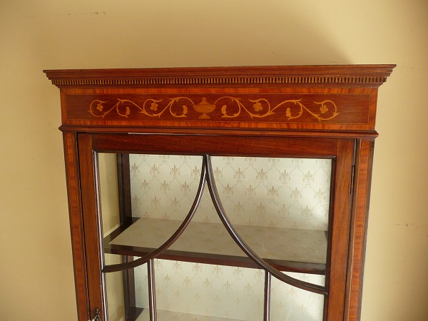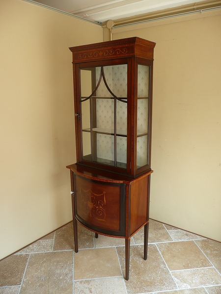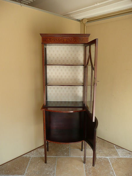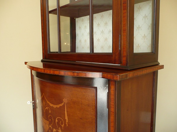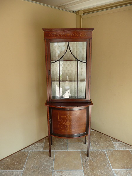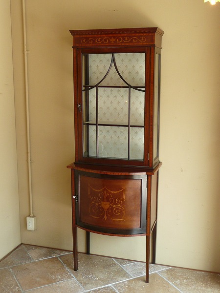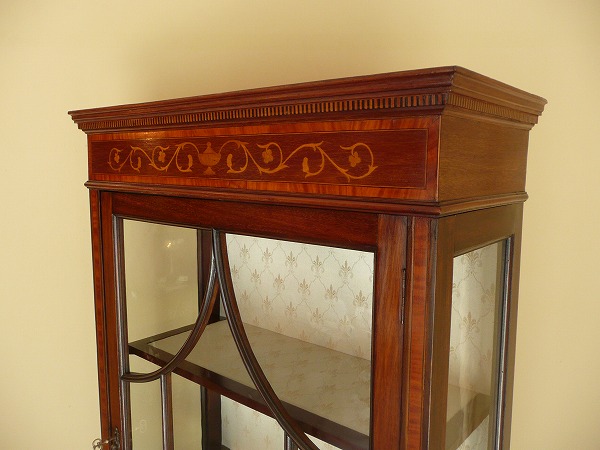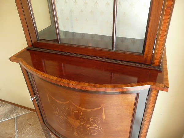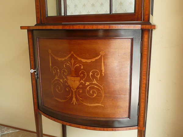 年月を重ねて更に深みを増した、アンティーク特有の風合いが色濃く映し出されています。厳選された上質のマホガニー材をベースに、エドワーディアンらしいボウフロント形状の下台扉部をはじめ、各所に丹念に配された繊細かつ気品漂う象嵌の美しさが最高の輝きを放ちます。