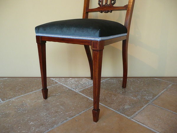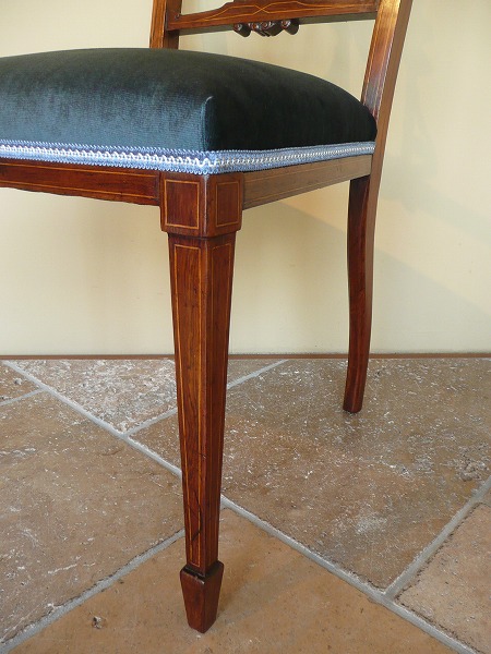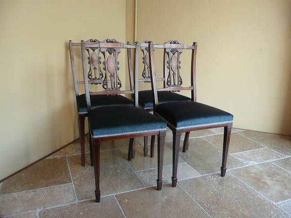 エドワーディアン期を象徴する、アンティーク特有の風合いが色濃く映し出されています。上質のローズウッド材をベースに、スプラット(背板)をはじめ各所に品良く取り入れられたインレイ(象嵌)とシェラトン様式の流れを汲むスペードレッグとが絶妙の調和を奏でています。