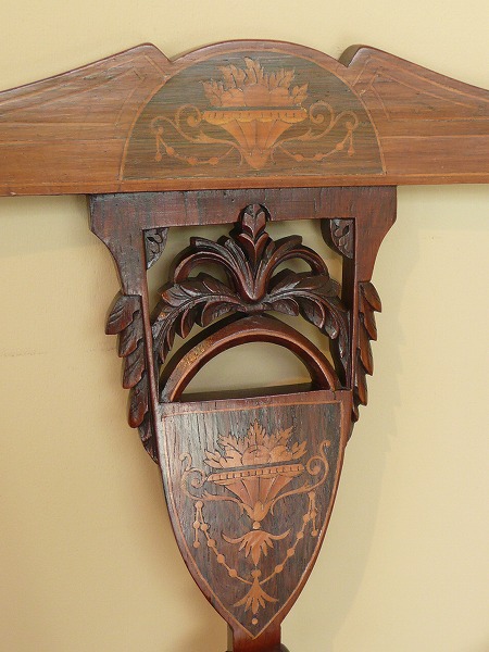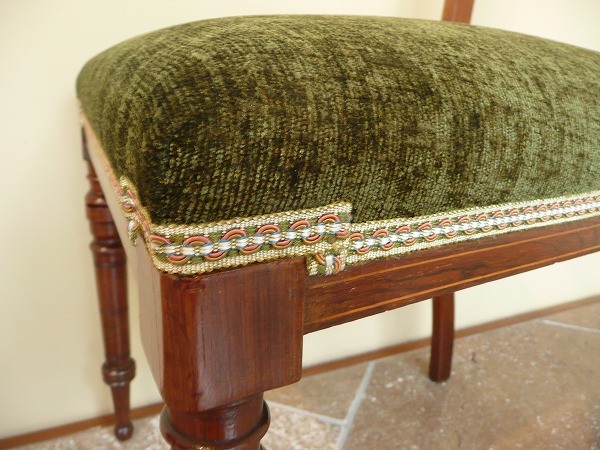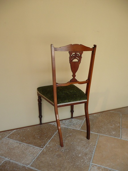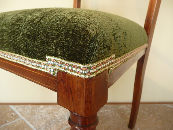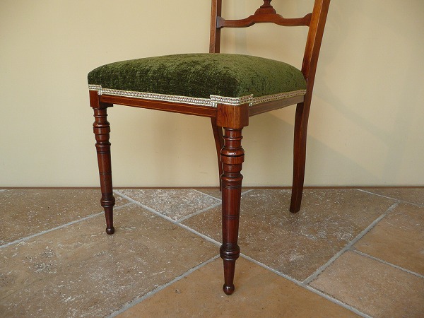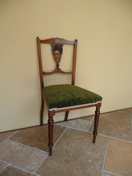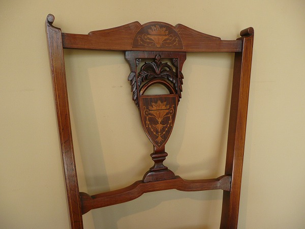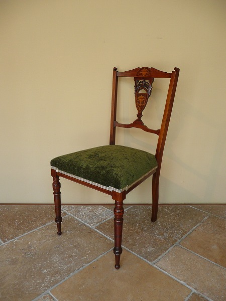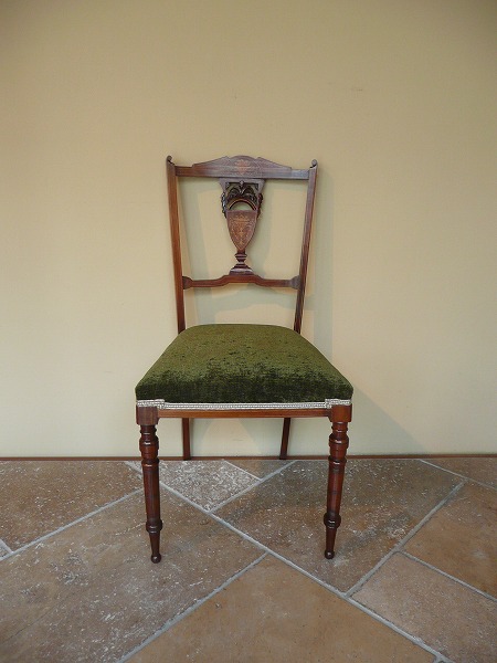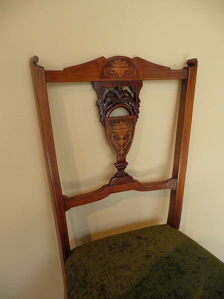 エドワーディアン期に生まれたスタイリングの美しさが際立つチェアー 厳選されたローズウッド材の特質が最大限に活かされた、トップレール(笠木)、スプラット(背板)をはじめ、各所に品良く取り入れられた、インレイ(象嵌)・透かし彫りが奥深いアンティークの魅力を物語っています。