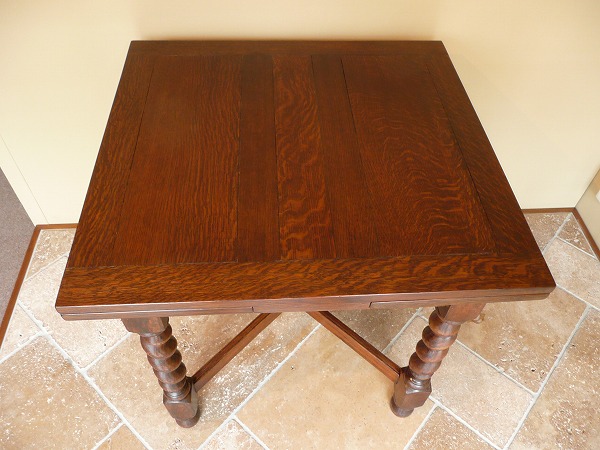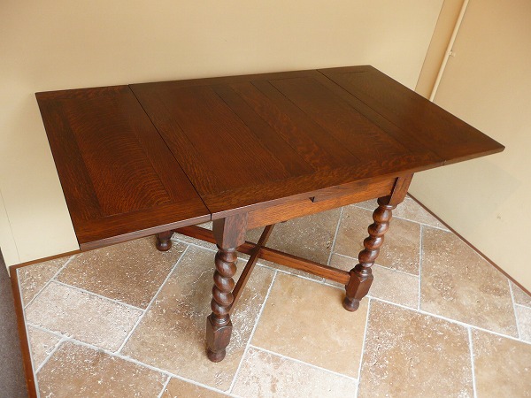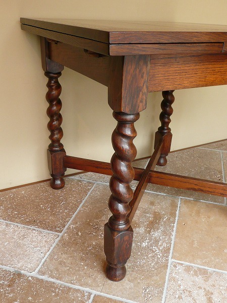 朧月を重ねて深みを増した、アンティーク特有のパティーナ(風合い)が色濃く映し出されています。ジャコビアン様式の流れを汲む、バリーシュガーツイストの彫刻装飾が際立ちます。