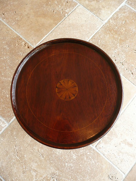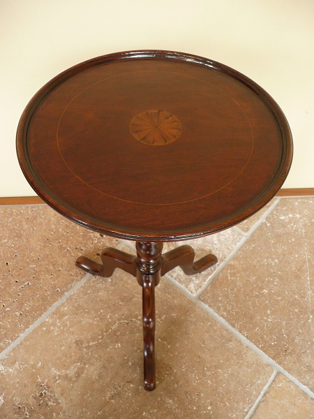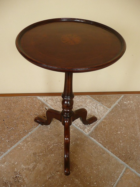朧月を重ねて深みを増したマホガニー材特有の高級感が漂います。トップに職人技術が活かされたクラシカルなマーケットリー(木象嵌)、脚部のトリポット(一柱式三脚)が際立ちます。