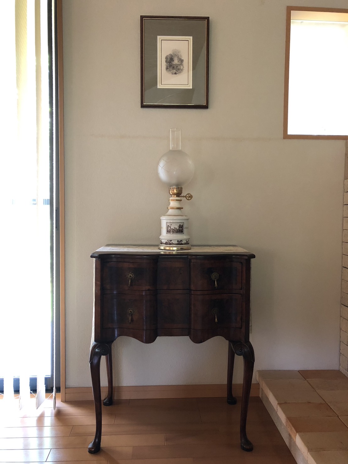英国スタイルを象徴する、ウィリアム・モリスのカーテンや壁紙が上品に取り入れられた素朴なお宅。この度、寝室には手工芸技術が冴え渡るインレイの美しいドレッシングチェスト、ヴィクトリアン期を代表する、彫刻とスタイリングの美しさが際立つバルーンバックチェアー、英国サンダーソン社ダンシングチューリップのファブリックを使用した布シェードに本体の繊細な彫刻とが絶妙の調和を奏でるフロアスタンドをお納めさせていただきました。